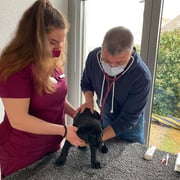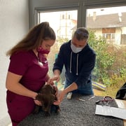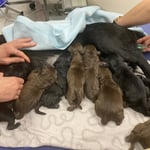 Nachdem die Geburt nicht voranschritt, entschlossen wir uns am Freitagabend 21.1.22 in die Klinik zu fahren. Nach einem Ultraschall war klar, es gibt einen Kaiserschnitt, der Uterus war gerissen und ein Welpli befand sich schon im Bauchraum. Alle Welpli waren fit mit tollen Geburtsgewichten zwischen 420 und 500g. Nachts um 2 Uhr fuhren wir nach Hause, die Welpli tranken schön bei Moon und alles sah gut aus. Aber Moon ging es am Morgen zusehends schlechter, sie bekam Fieber und war apathisch. Wieder in die Klinik, sie wurde stabilisiert und später wegen hohem Blutverlust nochmals operiert.  Ein grosses Dankeschön der Tierklinik Basel, die uns übers Wochenende rund um die Uhr perfekt betreut haben und danke Melanie und Kuba fürs Blut spenden!