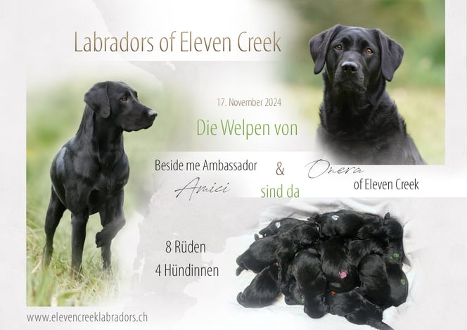 Als Deckrüden haben wir uns für Beside me Ambassador, genannt Amici entschieden. Amici ist der Vater unseres R-Wurfes. Wir sind von den Gesundheitsresultaten und dem Arbeitswillen dieser Hunde begeistert, deshalb haben wir uns wieder für Amici entschieden.